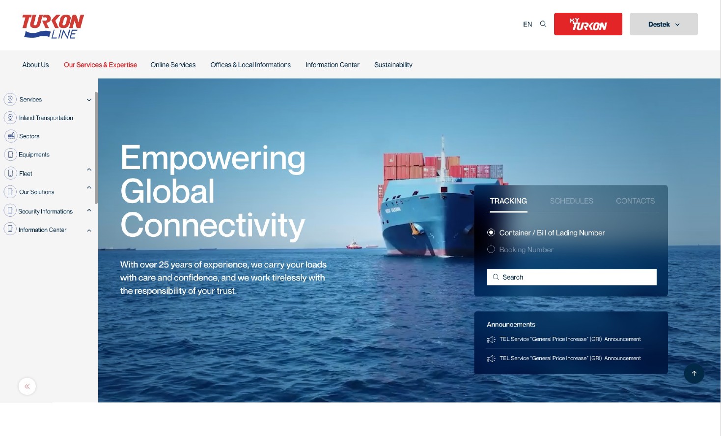 Deniz taşımacılığı sektöründe uluslararası standartlarda hizmet sunan Turkon Line, dijital varlığını güncel ihtiyaç ve beklentilere göre yeniden tasarlayarak yenilenen web sitesini hizmete açtı. Yeni web sitesi; gemi programı, konteyner takibi, servis detayları, lokal mevzuatlar ve diğer tüm hizmetlerin tek bir platformda toplanmasıyla, kullanıcılarına her cihazdan kolay, hızlı ve kesintisiz erişim sağlıyor.Yenilenen web sitesi ile birlikte: